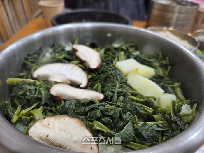 자리에 앉아 주문을 하면, 고급스러운 방짜 유기그릇(놋그릇)에 정갈하게 담긴 반찬들이 상을 가득 채운다. 메인 요리인 어수리 나물밥은 갓 지은 솥밥 형태로 제공된다. 뚜껑을 열면 포슬포슬한 감자, 표고버섯과 함께 짙은 초록빛을 뽐내는 어수리 나물이 모락모락 김을 피워 올린다. 미나릿과 특유의 향긋함이 밥알 하나하나에 배어 있다. 양념장에 슥슥 비벼 한 입 넣으면 입안 가득 영월의 봄이 퍼진다.