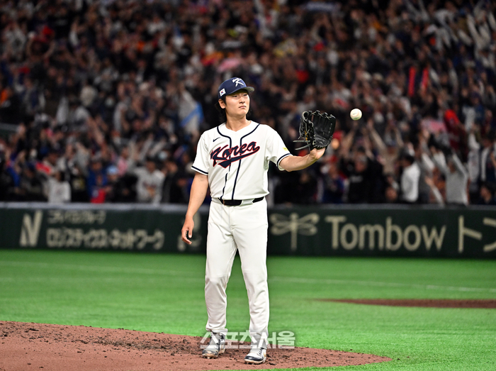 대한민국 야구대표팀의 곽빈이 8일 일본 도쿄 도쿄돔에서 열린 2026 월드 베이스볼 클래식(WBC) 조별리그 대만과의 경기 6회초 대만 정쭝저에게 솔로 홈런을 허용한 뒤 다시 공을 받고 있다. 2026. 3. 8.