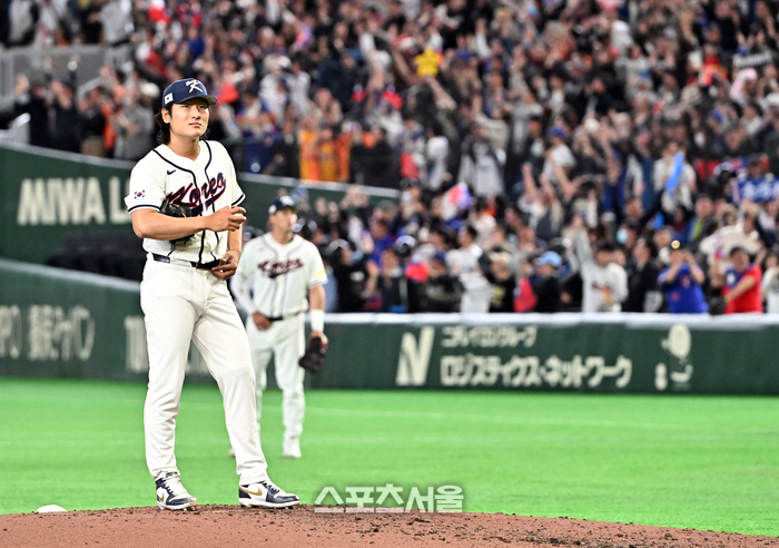 대한민국 야구대표팀의 곽빈이 8일 일본 도쿄 도쿄돔에서 열린 2026 월드 베이스볼 클래식(WBC) 조별리그 대만과의 경기 6회초 대만 정쭝저에게 솔로 홈런을 허용한 뒤 아쉬워하고 있다. 2026. 3. 8.