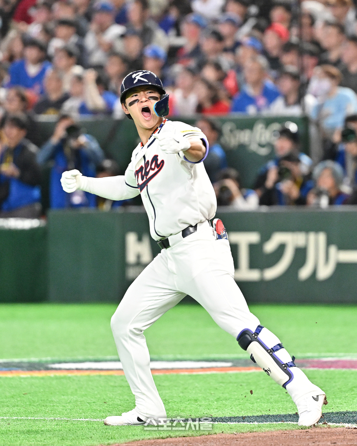 대한민국 야구대표팀의 김도영이 8일 일본 도쿄 도쿄돔에서 열린 2026 월드 베이스볼 클래식(WBC) 조별리그 대만과의 경기 6회말 1사 1루 상황에서 대만의 린웨이언에게 역전 2점 홈런을 친 뒤 기뻐하고 있다. 2026. 3. 8.