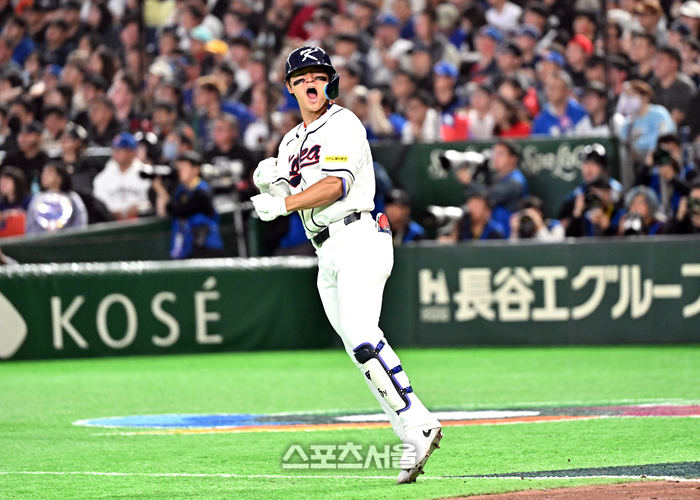 대한민국 야구대표팀의 김도영이 8일 일본 도쿄 도쿄돔에서 열린 2026 월드 베이스볼 클래식(WBC) 조별리그 대만과의 경기 6회말 1사 1루 상황에서 대만의 린웨이언에게 역전 2점 홈런을 친 뒤 기뻐하고 있다. 2026. 3. 8.
