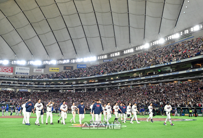 대한민국 야구대표팀이 8일 일본 도쿄 도쿄돔에서 열린 2026 월드 베이스볼 클래식(WBC) 조별리그 대만과의 경기 연장 승부 끝에 5-4로 패한 뒤 관중석을 향해 인사하고 더그아웃으로 들어가고 있다. 2026. 3. 8.