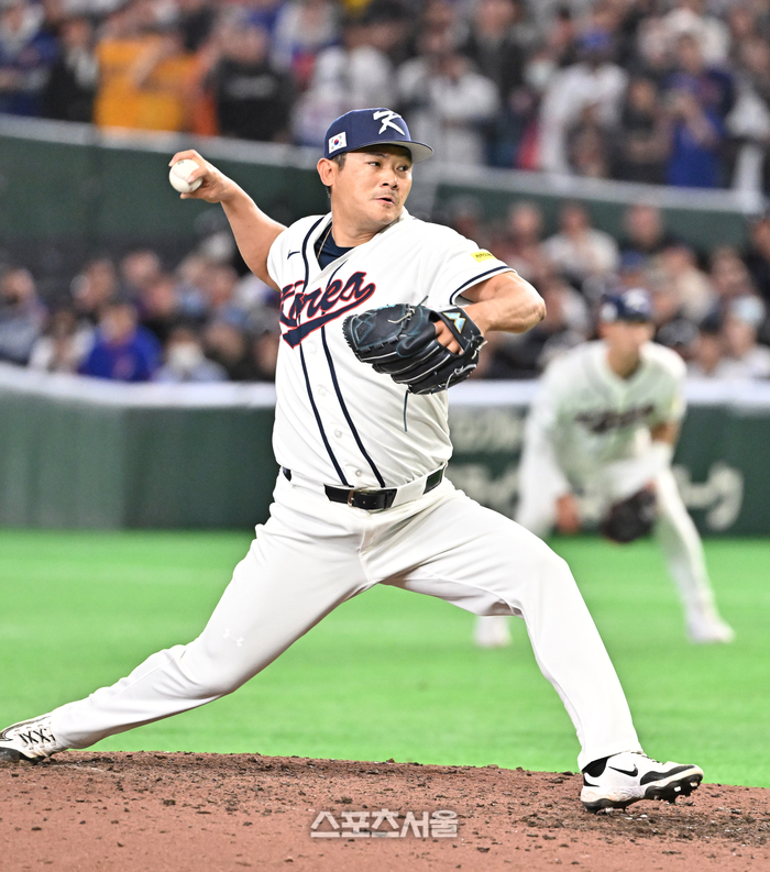 대한민국 야구대표팀의 노경은이 8일 일본 도쿄 도쿄돔에서 열린 2026 월드 베이스볼 클래식(WBC) 조별리그 대만과의 경기 10회초 등판해 힘차게 공을 던지고 있다. 2026. 3. 8.