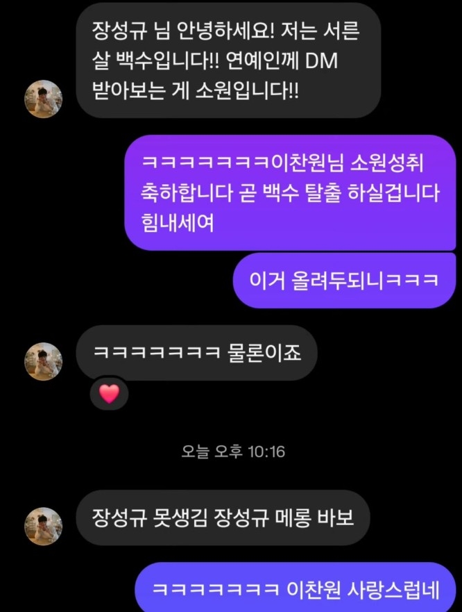 이찬원은 장성규에게 “장성규 님 안녕하세요! 전 서른 백수입니다. 연예인께 DM 받아보는 게 소원입니다”라는 메시지를 전송했다. 이에 장성규는 “이찬원 님 소원 성취 축하합니다. 곧 백수 탈출하실 겁니다. 힘내세요”라고 화답했다.