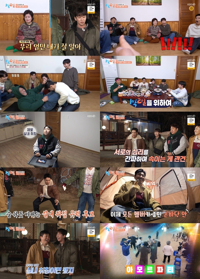 무리해 보였던 계획은 김종민이 남은 라운드에서 모두 1등을 차지하면서 현실이 됐다. 다른 멤버들의 방 정체를 모두 알아낸 그는 또 다른 ‘실내 취침 방’의 주인이었던 딘딘과 함께 실내 취침을 확정 지었다. 끝내 ‘야외 취침 방’에서 벗어나지 못한 문세윤, 이준, 유선호는 인천 앞바다에 마련된 텐트에서 하룻밤을 보냈다.