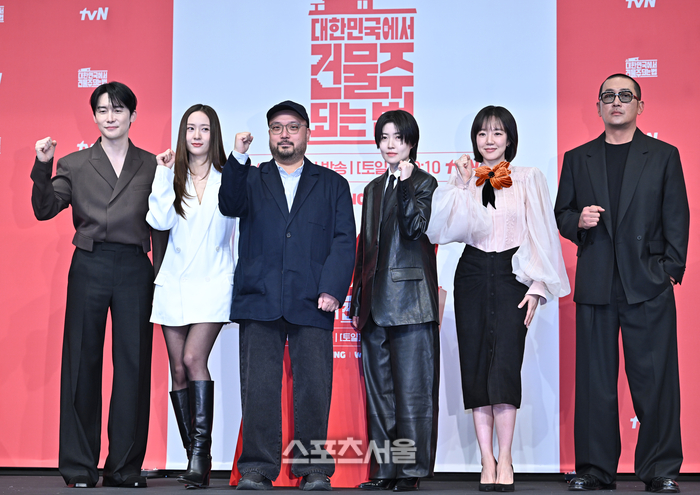 김준한, 정수정, 임필성 감독, 심은경, 임수정, 하정우(왼쪽부터)가 9일 더링크 서울 트리뷰트포트폴리오 호텔에서 열린 tvN 토일드라마 ‘대한민국에서 건물주 되는 법’ 제작발표회에서 포즈를 취하고 있다.