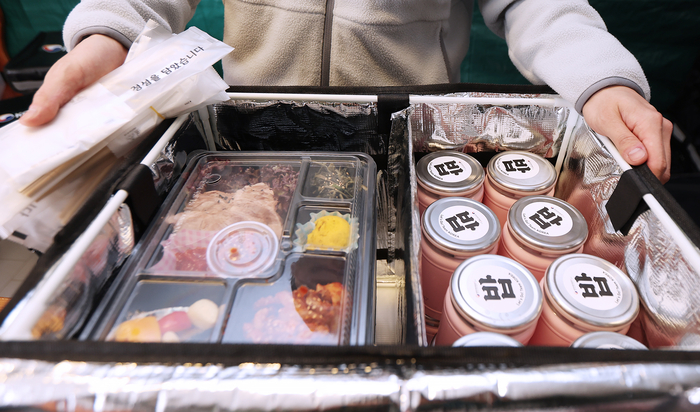 밥과 국은 기본이다. 5~6가지 반찬이 담긴 도시락이 또 따로다. 이외에 김치가 있고, 과일도 같이 간다. 김을 비롯한 사이드 메뉴도 있다. 모양이 급식일 뿐, 잘 차린 한정식 그 자체다.