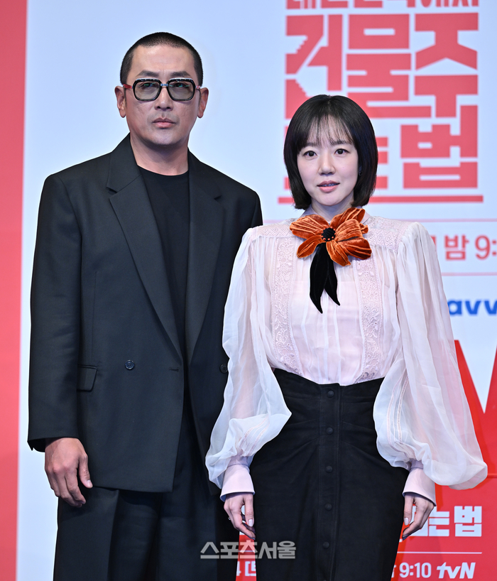하정우, 임수정이 9일 더링크 서울 트리뷰트포트폴리오 호텔에서 열린 tvN 토일드라마 ‘대한민국에서 건물주 되는 법’ 제작발표회에서 포즈를 취하고 있다.