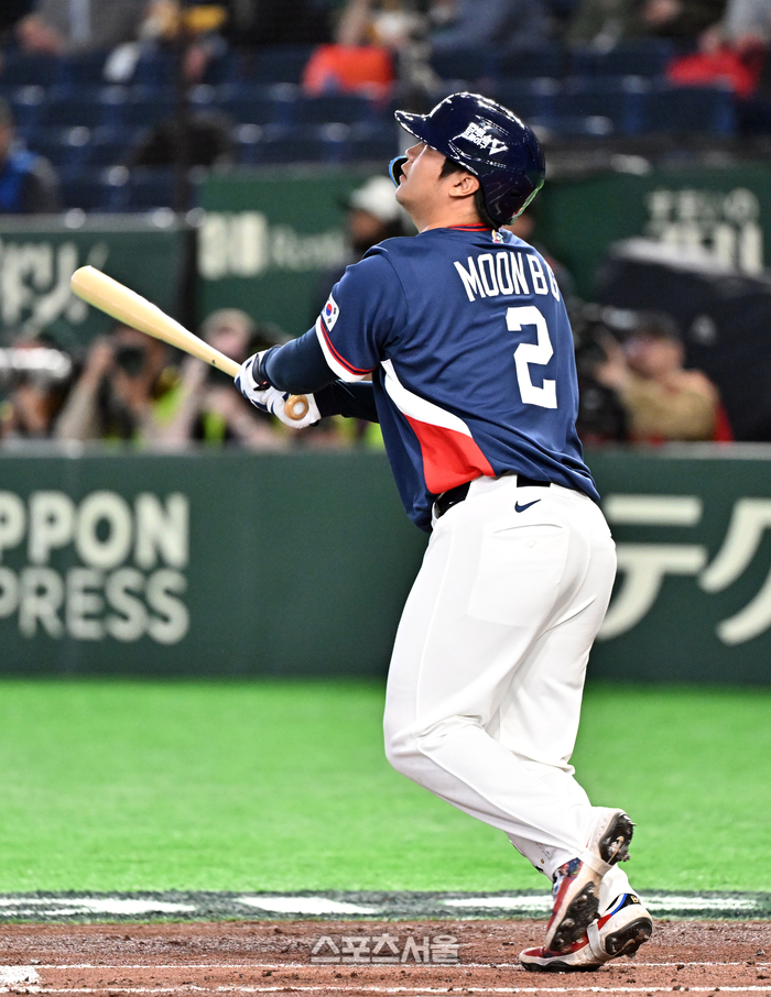 대한민국 야구대표팀의 문보경이 9일 일본 도쿄 도쿄돔에서 열린 2026 월드 베이스볼 클래식(WBC) 조별리그 호주와의 경기 2회초 무사 1루 상황에서 호주 선발 라클란 웰스를 상대로 선제 2점 홈런을 치고 있다. 2026. 3. 9.
