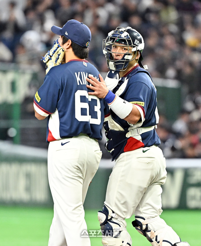 대한민국 야구대표팀의 포수 박동원(오른쪽)이 9일 일본 도쿄 도쿄돔에서 열린 2026 월드 베이스볼 클래식(WBC) 조별리그 호주와의 경기 8회말 1사 2루 상황에서 호주 바자나에게 적시타를 허용한 뒤 투수 김택연의 등을 두드리고 있다. 2026. 3. 9.