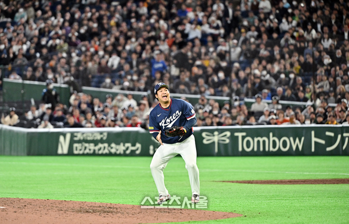 대한민국 야구대표팀의 문보경이 9일 일본 도쿄 도쿄돔에서 열린 2026 월드 베이스볼 클래식(WBC) 조별리그 호주와의 경기 9회말 2사 1루 상황에서 웨이드의 뜬공을 잡아내며 8강행 진출을 확정 지으면서 기뻐하고 있다. 2026. 3. 9.