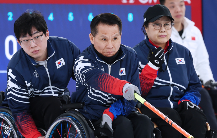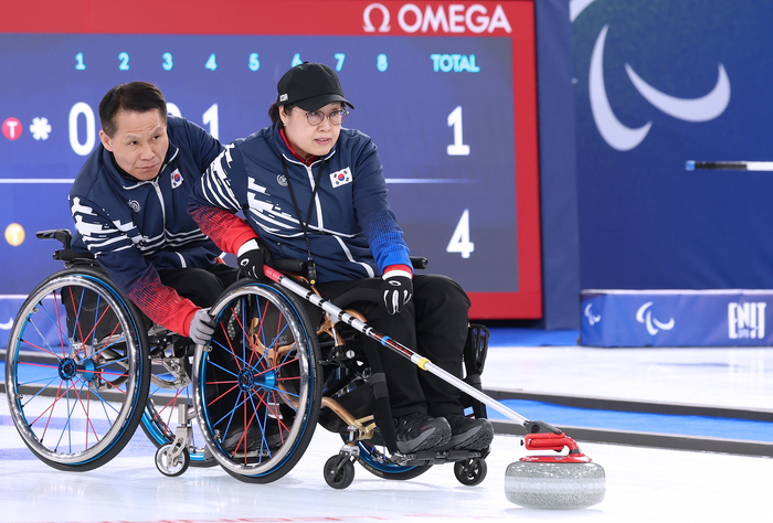 [스포츠서울 | 테세로=김동영 기자] 남봉광(45)-차진호(54·이상 경기도장애인체육회)-방민자(64·전라남도장애인체육회)-양희태(58)-이현출(40·이상 강원특별자치도장애인체육회)로 구성된 휠체어컬링 한국 혼성 대표팀이 준결승 진출 청신호를 밝혔다.