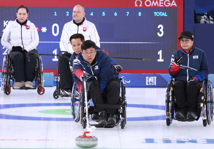 세계랭킹 5위 한국은 9일(현지시간) 이탈리아 코르티나 컬링 올림픽 스타디움에서 열린 2026 밀라노·코르티나 동계패럴림픽 휠체어컬링 혼성팀 예선 5차전 슬로바키아(랭킹 7위)와 경기에서 7–5로 이겼다.