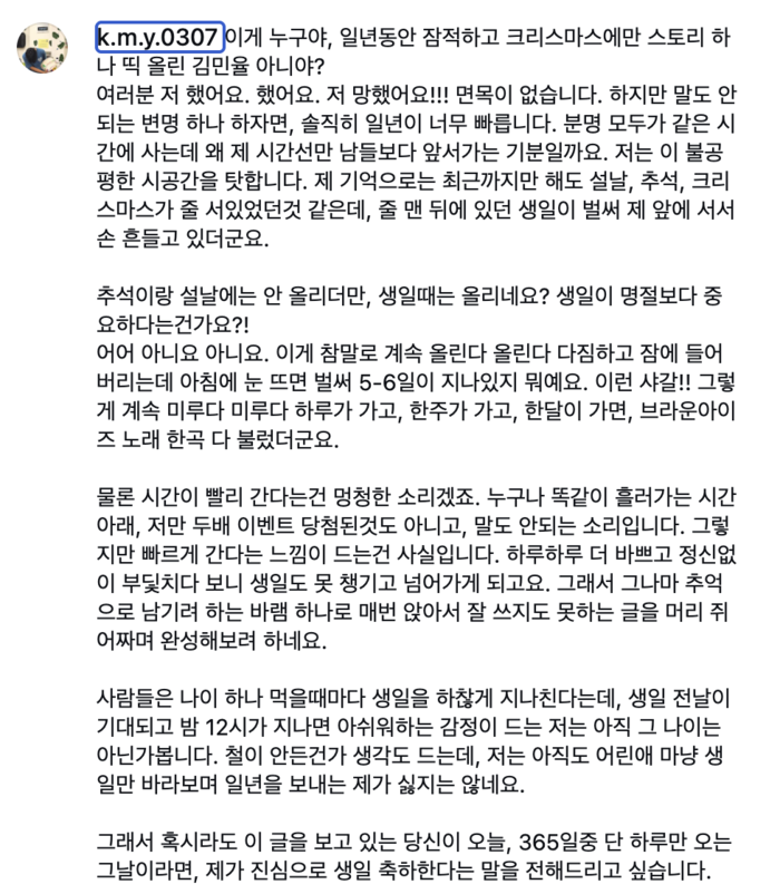 김민율은 긴 공백기에 대해 특유의 문학적이고 재치 있는 화법으로 해명했다. 그는 “면목이 없다. 말도 안 되는 변명을 하자면 솔직히 일 년이 너무 빠르다”며 “분명 모두가 같은 시간에 사는데 왜 제 시간선만 앞서가는 기분일까. 불공평한 시공간을 탓한다”고 적어 웃음을 자아냈다.