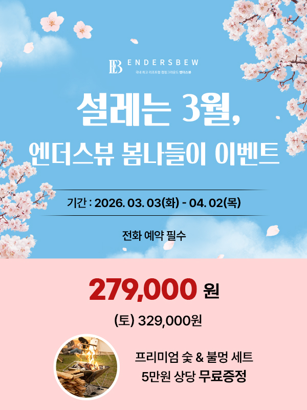 [스포츠서울 | 김종철 기자] 춘천 프라이빗 리조트 엔더스뷰가 봄 시즌을 맞아 ‘설레는 3월, 엔더스뷰 봄나들이 이벤트’를 진행한다고 밝혔다.