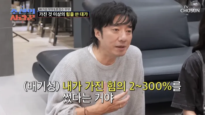 이날 배기성은 자연 임신을 위해 노력하던 과정에서 예상치 못한 건강 문제를 겪었다고 고백했다. 그는 “자연 임신을 위해 8일 연속으로 노력하다가 돌발성 난청이 왔다”고 밝혔다. 이어 “병원에 갔더니 ‘가지고 있는 것보다 더 많은 기력을 썼다’는 말을 들었다”고 설명하면서도 “그래도 그걸 인정하고 싶지 않다”며 너스레를 떨어 웃음을 자아냈다.
