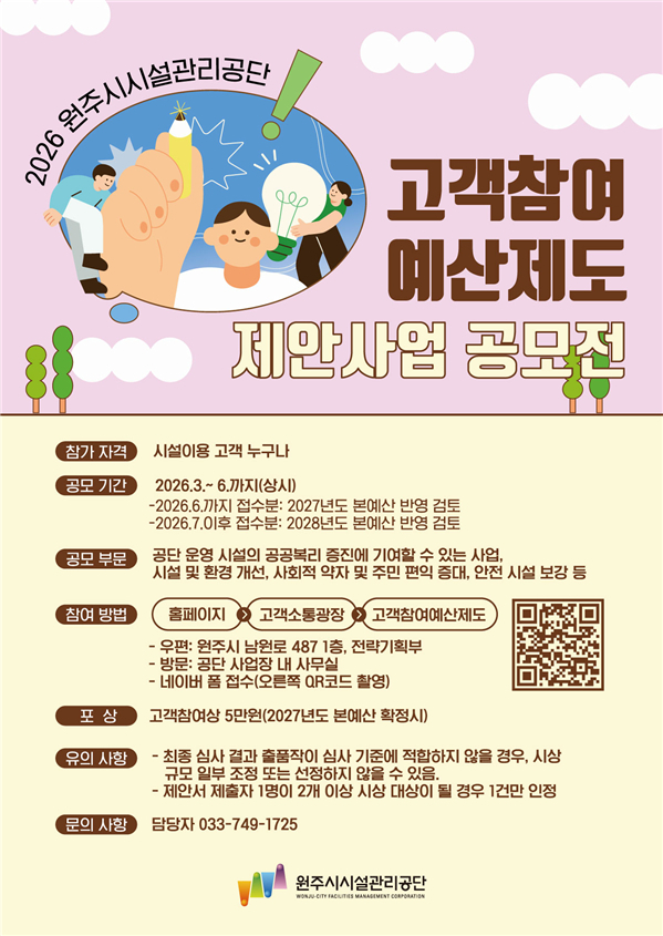 [스포츠서울ㅣ원주=김기원 기자]원주시시설관리공단은 2026년도 고객참여 예산 제도를 운영한다.