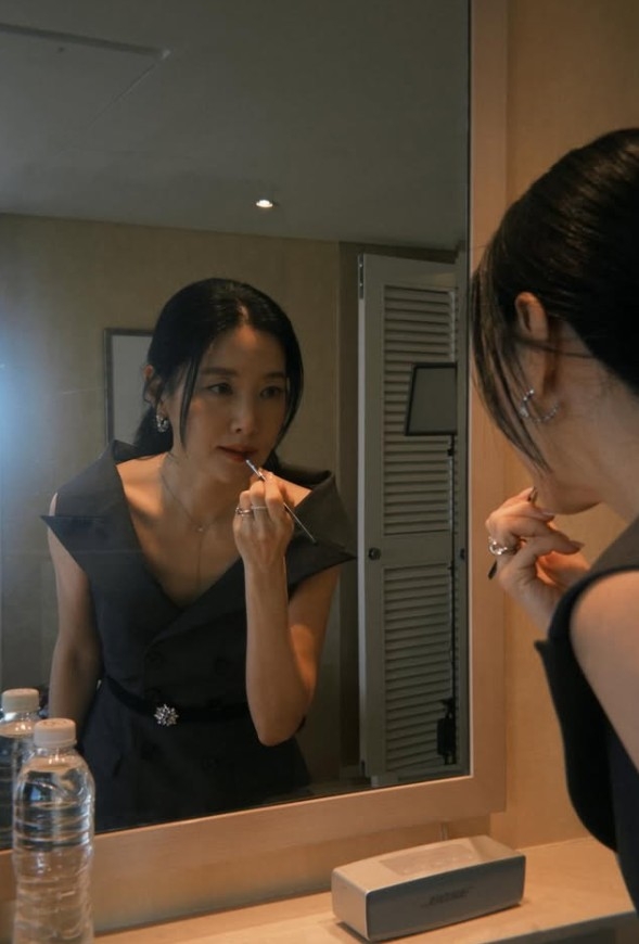 이어 이영애는 원피스로 갈아입은 뒤 화장을 하는 모습으로 우아한 분위기를 선보여 이목을 끈다.