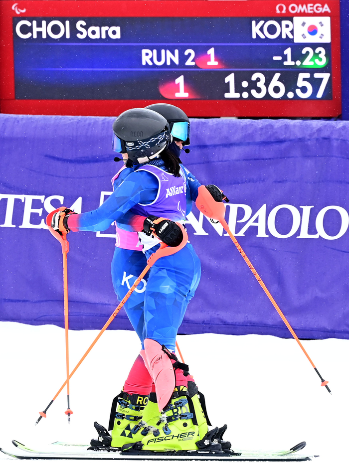 최사라는 어은미 가이드와 호흡을 맞춰 이번 2026 밀라노·코르티나 동계패럴림픽 알파인스키 5종목에 나섰다. 활강을 시작으로 슈퍼대회전, 알파인 복합, 대회전, 회전까지 다 뛰었다.