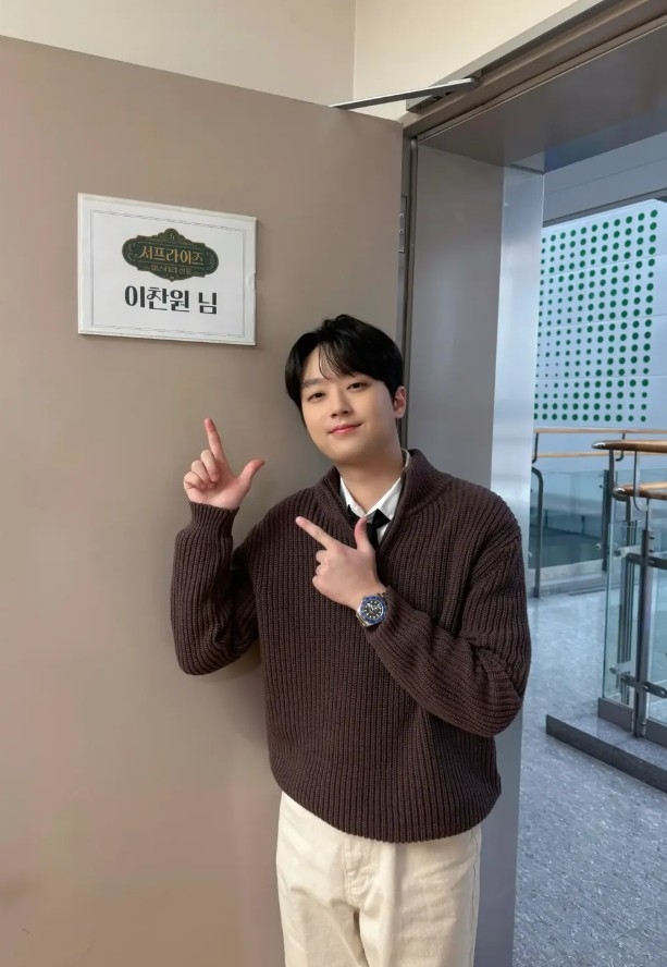 공개된 사진 속 이찬원은 짙은 갈색 니트에 셔츠와 넥타이를 매치한 단정한 스타일로 댄디한 매력을 뽐내며, 자신의 이름이 적힌 대기실 문 앞에서 포즈를 취하고 있다.