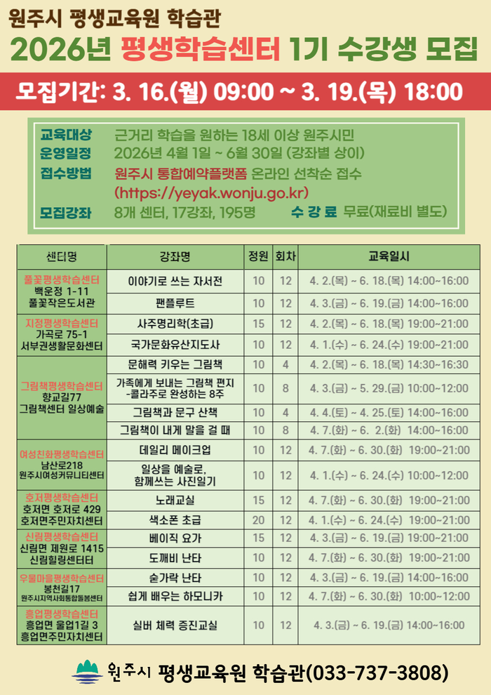 [스포츠서울ㅣ원주=김기원 기자]원주시 평생교육원 학습관은 3월 16일부터 19일까지 2026년 평생학습센터 1기 수강생을 모집한다.