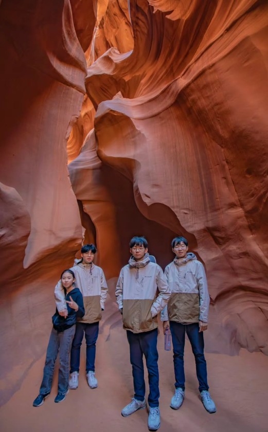 공개한 사진에서 삼둥이와 사촌 여동생은 미국 애리조나주 앤털롭 캐년으로 보이는 붉은 사암 협곡을 배경으로 나란히 서 있는 모습이다.