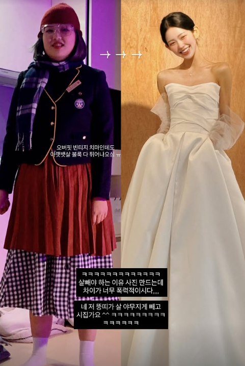 이날 공개된 사진 속엔 학창시절 다이어트 전인 최준희와 결혼을 준비하는 지금의 모습이 담겨있다.