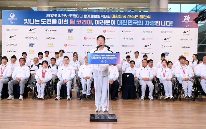 최휘영 장관은 축사를 통해 “이번 밀라노·코르티나 동계패럴림픽은 대한민국 스포츠사에 길이 남을 기념비적인 대회였다”며 선수단의 노고를 격려했다. 또한 “정부는 이번 대회 성과가 일시적인 것에 그치지 않도록 지속적인 관심을 가지고 장애인체육 환경 개선을 위해 더욱 힘쓰겠다”고 밝혔다.