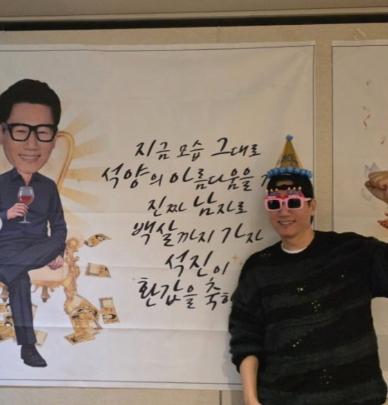 지석진도 “지금 모습 그대로 석양의 아름다움을 가진 진짜 남자로 백 살까지 가자. 석진이 환갑을 축하해”라는 문구의 현수막 앞에서 고깔모자와 익살스러운 선글라스를 끼고 포즈를 취하고 있다.