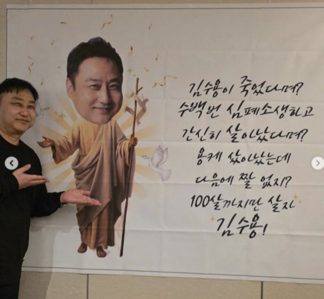 김수용은 “김수용이 죽었다네? 수백 번 심폐 소생하고 간신히 살아났다며? 용케 살아났는데 다음에 짤 없지(예외없지)? 100살까지만 살자”라는 메시지가 담긴 현수막 앞에서 미소를 지으며 카메라 렌즈를 응시했다.