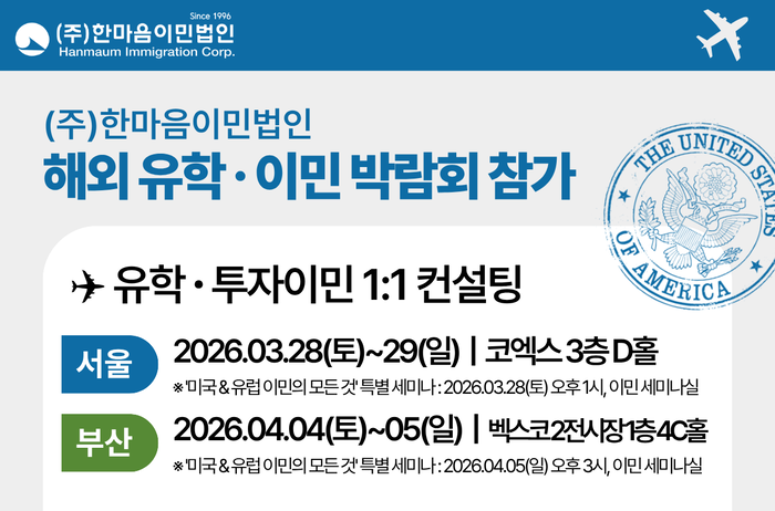 이러한 위기 상황 속에서 해외 이민 및 투자 컨설팅 전문업체 한마음이민법인(대표 김미현)은 자녀의 성공적인 미국 정착을 고민하는 학부모들을 위해 특별한 해법을 제시한다. 한마음이민법인은 오는 28~29일 서울 코엑스와 내달 4~5일 부산 벡스코에서 열리는 ‘해외 유학·이민 박람회’에 참가해 1:1 컨설팅 서비스를 진행한다고 18일 밝혔다.