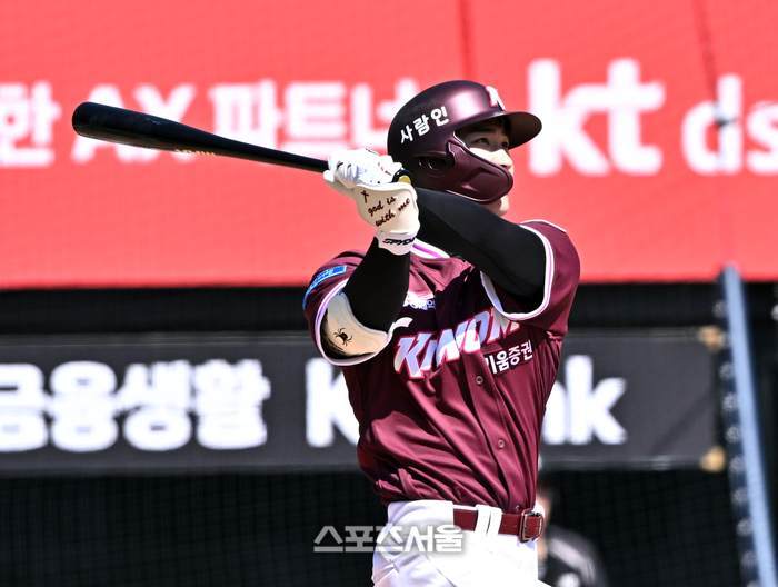 키움 이주형이 19일 수원 KT위즈파크에서 열린 KT와의 시범경기 3회초 2사 KT 선발 보쉴리를 상대로 동점 솔로 홈런을 치고 있다. 2026. 3. 19.