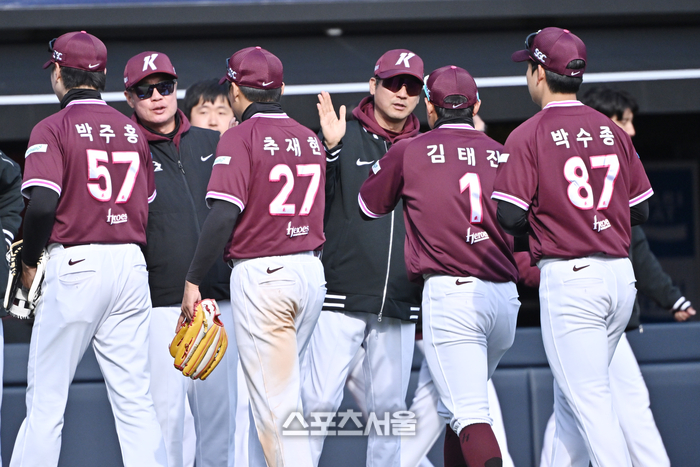 키움 설종진 감독(가운데)이 19일 수원 KT위즈파크에서 열린 KT와의 시범경기에서 11-4로 승리한 뒤 선수들과 하이파이브를 나누고 있다. 2026. 3. 19.