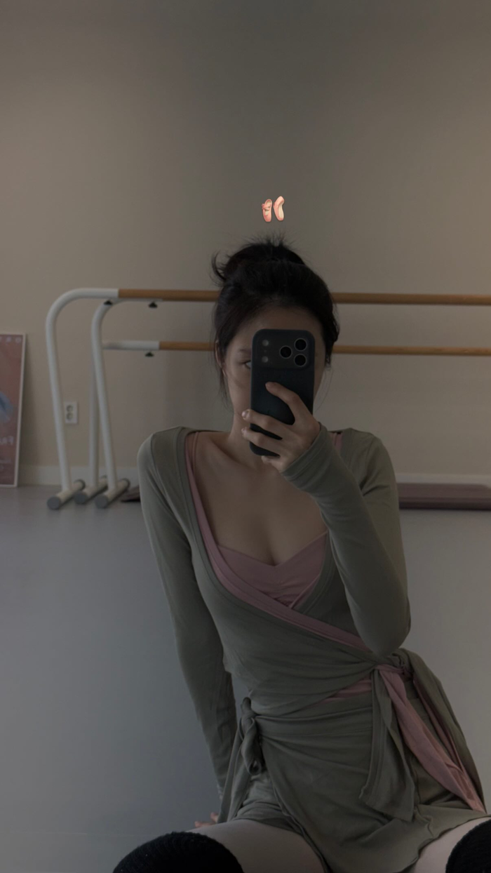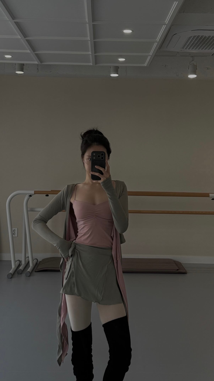 특히 핑크 톤 이너와 카키 컬러 랩 스타일 의상을 매치해 은은하면서도 세련된 무드를 완성했다. 슬림한 실루엣과 군살 없는 몸매가 돋보이며, 블랙 니삭스로 포인트를 더해 감각적인 스타일링을 선보였다.