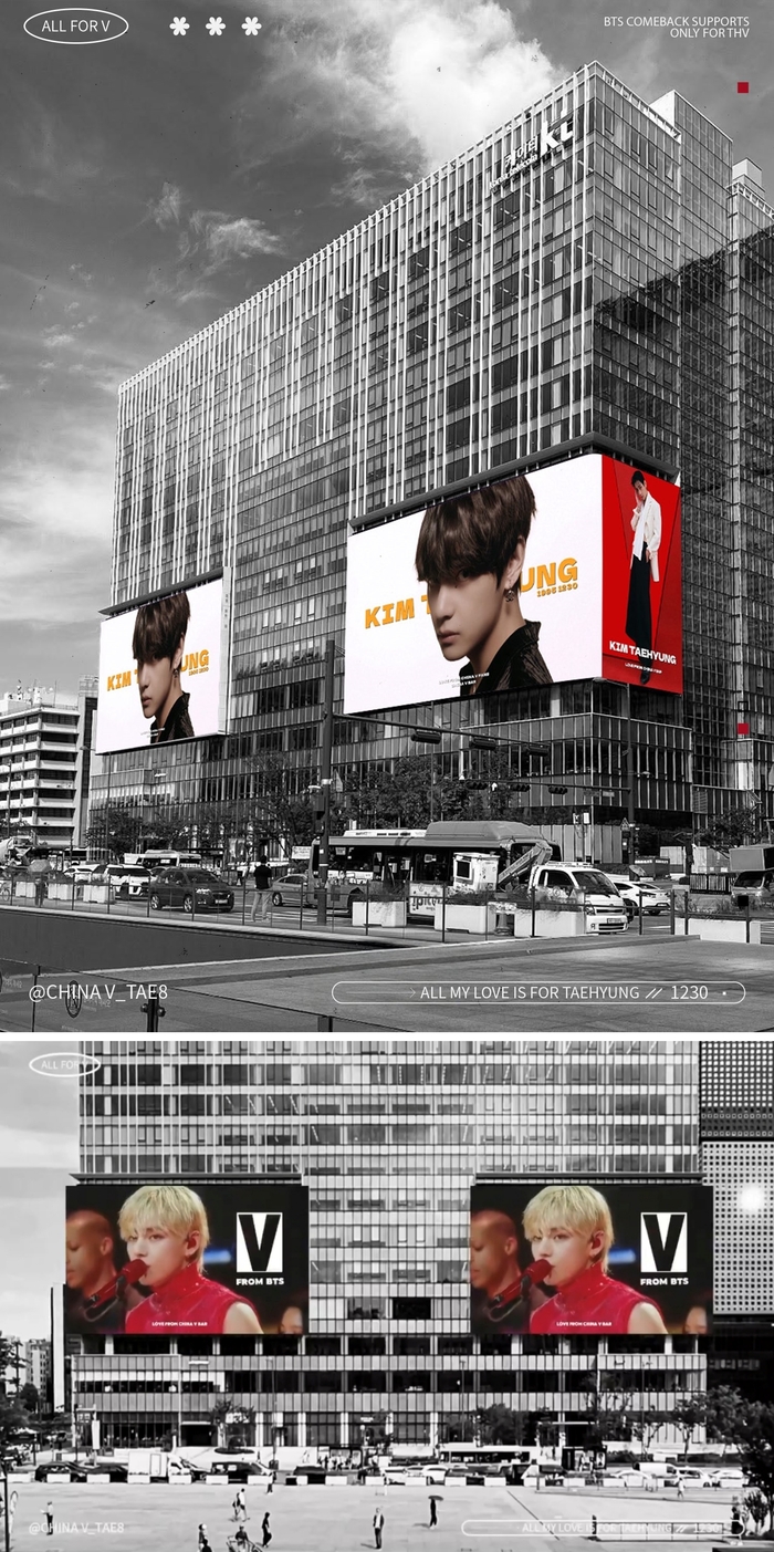 뷔의 중국 팬클럽 바이두뷔바는 광화문 KT 스퀘어 더블 스크린에 컴백 축하 영상을 송출한다. 광화문 광장과 세종문화회관 인근에 위치한 KT 스퀘어는 서울 중심부를 대표하는 전광판으로, 1770㎡ 규모의 2면 스크린이 설치된 공간이다.