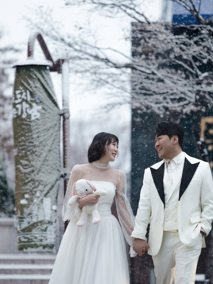 반면 눈 내리는 배경 속에서 서로의 손을 잡고 다정하게 바라보는 모습이나, 유리 돔 속 장미꽃 조명을 함께 응시하는 사진에서는 진지하고 로맨틱한 분위기를 연출해 반전 매력을 선사했다.