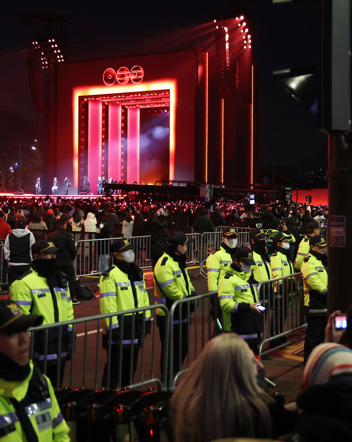 우리나라 안전 행정의 철저한 대비가 돋보인 덕분이다. 일찌감치 현장에 투입된 경찰과 안전요원들은 경광봉을 흔들며 빽빽하게 들어찬 인파를 끊임없이 분산시키고 동선을 우회시켰다. 광장 진입로에는 금속 탐지기가 설치됐고, 공항 검색대를 방불케 하는 철저한 가방 및 소지품 검사가 이뤄졌다. 만일의 사태를 대비해 구급차와 소방차가 인근에 촘촘하게 배치되며 시민들의 심리적 안정감을 더했다.