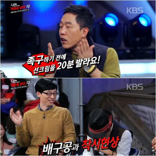 당시 방송에서 그는 "족구를 하러 간 적이 있는데 안경도 벗고 눈 밑까지 덕지덕지 바르더라"라고 전했다. 이에 유재석은 멋쩍은 듯 "자외선 차단제를 너무 심하게 발라서 옆 친구가 나를 배구공인 줄 알고 잘못 쳤다"고 말해 좌중의 웃음을 자아냈다.