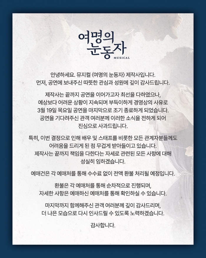 제작사 넥스트스케치는 지난 22일 SNS를 통해 “경영상의 사유로 19일 공연을 마지막으로 조기 종료하게 됐다”고 공식 입장을 밝혔다. 이에 따라 예정됐던 공연은 모두 취소됐으며 이미 예매한 관객들에게는 전액 환불 조치가 이뤄질 예정이다.