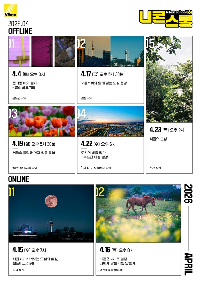 온라인 강의는 공식 유튜브 채널을 통해 ▲15일 ‘사진가가 바라보는 도심의 심장, 랜드마크 타워!’ ▲16일 ‘니콘 Z 시리즈 설정, 나에게 맞는 세팅 만들기’ 등으로 촬영 핵심 노하우와 개인화된 설정법을 소개한다.