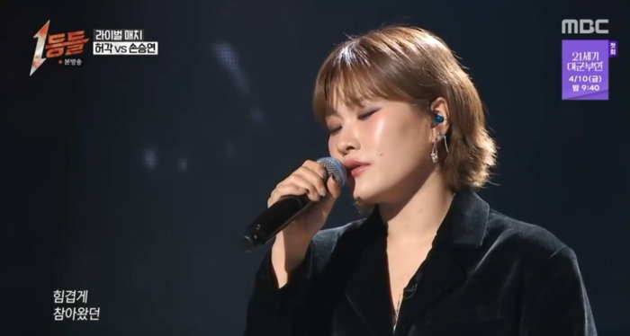 손승연은 22일 MBC ‘1등들’에서 1대1 라이벌 매치에 나섰다. 기존 줄세우기 방식에서 벗어난 이번 대결에서 손승연은 허각과 맞붙게 되자 “제대로 된 한방을 보여줘야겠다”라며 각오를 드러냈다.