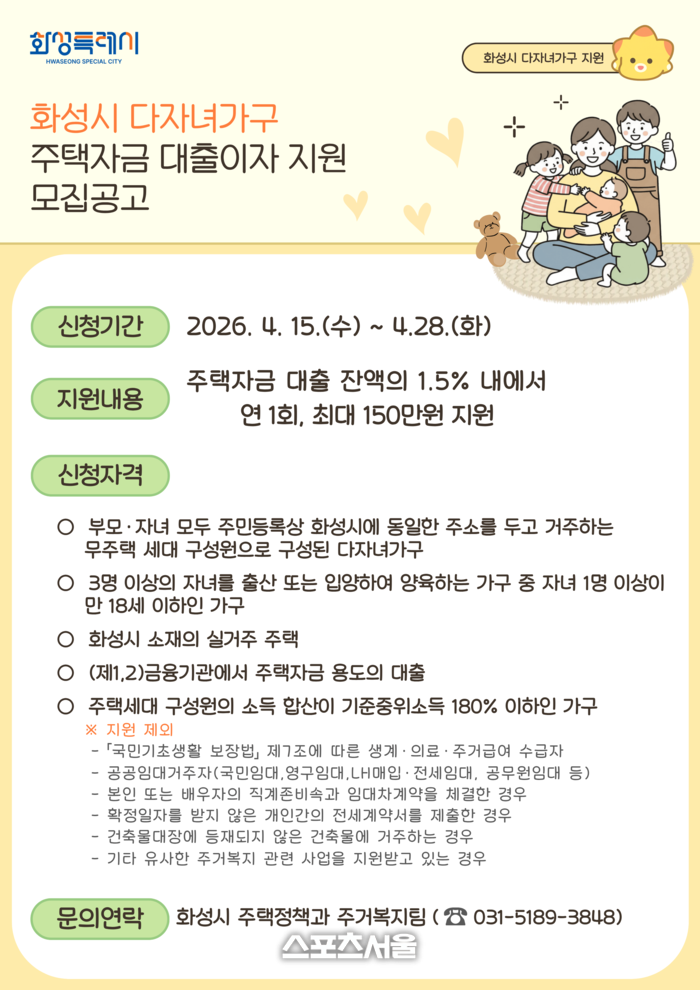 〔스포츠서울│화성=좌승훈기자〕경기 화성시는 무주택 신혼부부와 다자녀 가구의 주거부담을 완화하고 안정적인 정착을 돕기 위한 ‘주택(전세)자금 대출이자’ 지원사업 대상자를 모집한다고 23일 밝혔다.