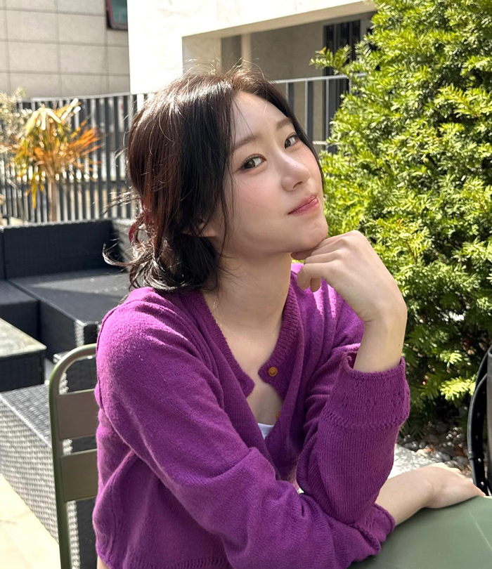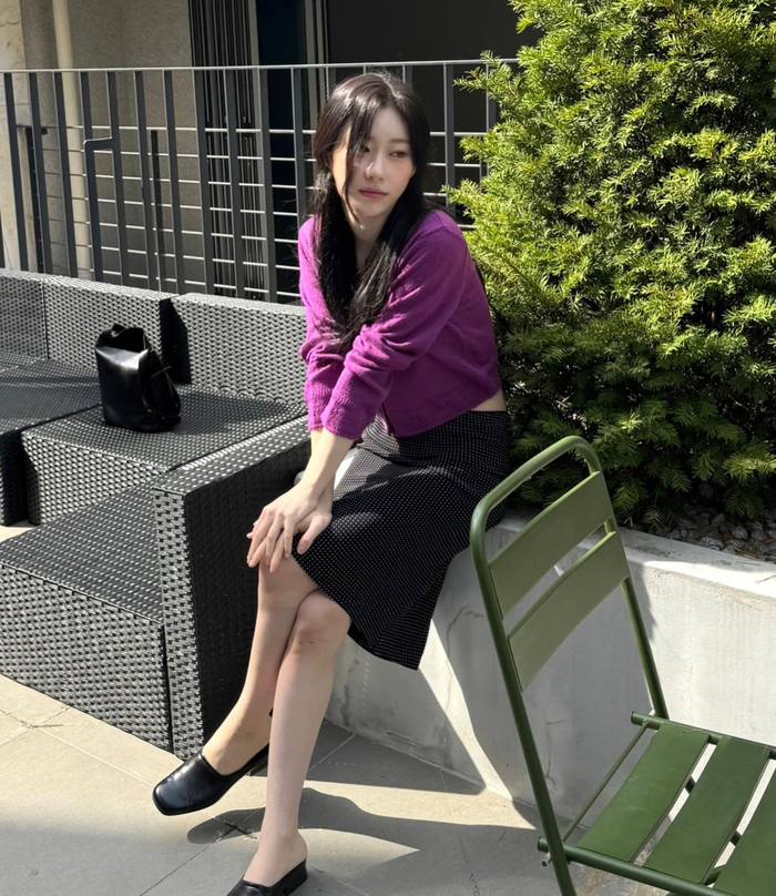공개된 사진 속 채령은 화사한 퍼플 컬러의 크롭 가디건과 도트 무늬 미니스커트를 매치해 트렌디하면서도 사랑스러운 봄 패션을 선보였다. .