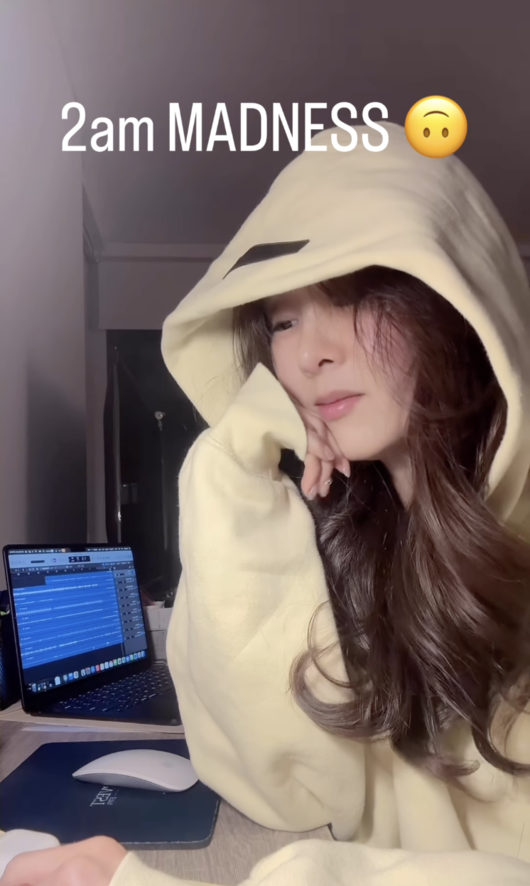 지나는 지난 22일 자신의 소셜미디어(SNS)에 “#2am #madness”라는 문구와 함께 노래를 부르고 있는 영상을 공개했다. 후드를 둘러쓴 그의 옆에는 곡 작업 중인 것으로 보이는 노트북도 놓여있다.