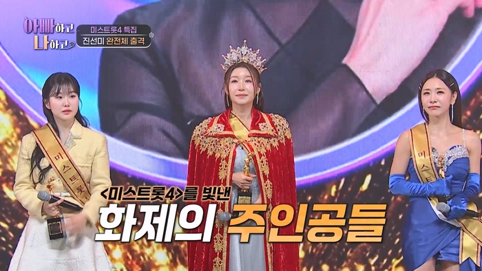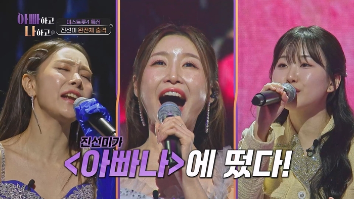 ‘미스트롯4’ 진선미는 이날 ‘아빠하고 나하고’를 위해 특별한 무대를 준비했다. 이들의 합동 무대는 이번주 방송에서 최초로 공개된다. 진선미 완전체가 무대를 바로 앞에서 준비하자, 김정태와 수빈은 “여기서 하는 거예요?”라며 직관 1열의 행운에 환호했다. 진선미의 라이브 무대에 스튜디오의 분위기는 후끈하게 달아올랐고, ‘찐팬’에서 ‘성덕’이 된 현주엽은 어느 때보다도 환한 미소로 무대를 즐겼다.
