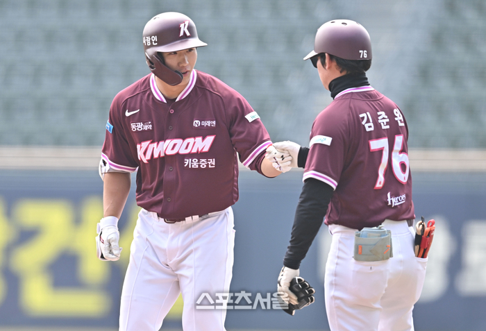 키움 이주형이 24일 서울 잠실구장에서 열린 2026 KBO리그 시범경기 LG전 1회초 우전안타를 친 후 김준완 코치와 하이파이브를 하고 있다.