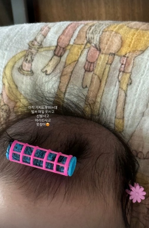 공개된 사진에는 그의 둘째 딸의 머리 부분이 클로즈업된 모습이 담겼다. 아직 머리숱이 많지 않지만 앞머리에 핑크색 헤어롤을 말고, 작은 꽃 모양 머리핀도 꽂혀 있는 등 아기를 꾸며주고 싶은 마음이 드러나 눈길을 끌었다.