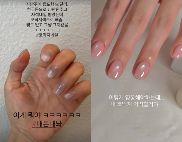 그는 지난주 “팁 포함 96달러, 한국 돈으로 약 14만 원을 주고 자석 네일을 받았는데 코딱지색으로 해줬다”며 “빛도 없고 그냥 그지같다”고 솔직한 심정을 밝혔다.