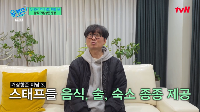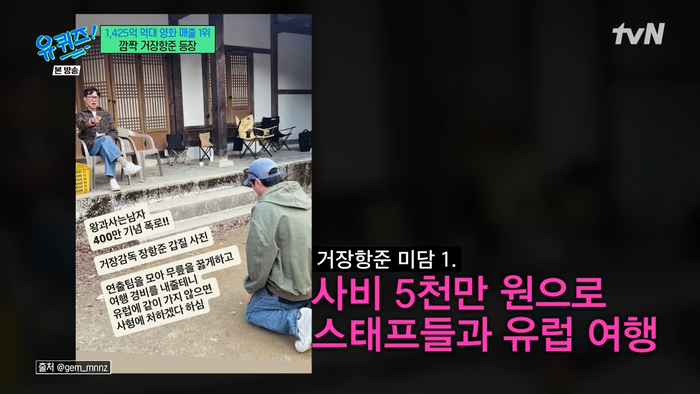 유지태는 25일 방송된 tvN ‘유 퀴즈 온 더 블럭’에 출연해 장항준 감독의 부탁대로 감독의 미담을 전했다. 유지태는 “(장항준 감독이)‘이런 얘기 좀 해줘’해서 말씀드린다”며 전제를 깐 뒤 “사비 5천 만원을 쾌척해서 스태프 데리고 유럽을 다녀오는 모습이 좋은 기억을 만들어 주기 위해 노력하신다”고 첫 미담을 전했다.