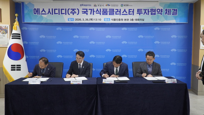 [스포츠서울ㅣ김기원 기자]한국식품산업클러스터진흥원(이사장 김덕호, 이하 식품진흥원)은 전북특별자치도, 익산시와 함께 국가식품클러스터 입주기업 에스시디디(주)(대표이사 강병수, 이하 SCDD)의 제3공장 확장을 위한 투자협약(MOU)을 3월 26일 체결했다고 밝혔다.